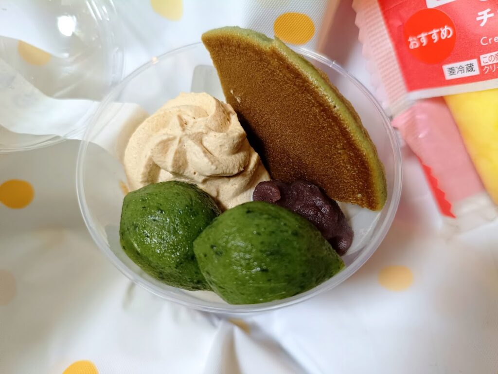 ミルクホイップクリーム、よもぎ団子、つぶあん、どらやきがしっかり入っています。
