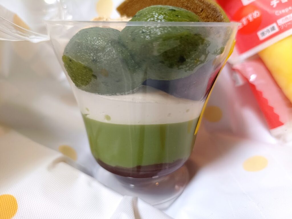 よもぎミルクプリンとミルクホイップクリーム、そして一番下につぶあんの層になっています。