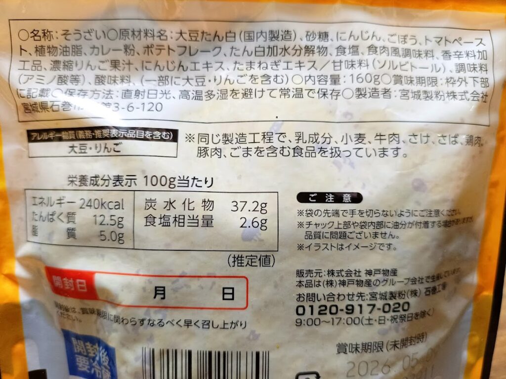 大豆たん白(国内製造)、砂糖、にんじん、ごぼう、トマトペースト、植物油脂、カレー粉、ポテトフレーク、たん白加水分解物、食塩、食肉風調味料、香辛料加工品、濃縮りんご果汁、にんじんエキス、たまねぎエキス/甘味料(ソルビトール)、調味料 (アミノ酸等)、酸味料、(一部に大豆・りんごを含む)
