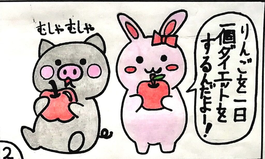 4コマの話ですが「うさ」がりんごを1日1個しか食べない、というダイエットを始めるのですが・・・